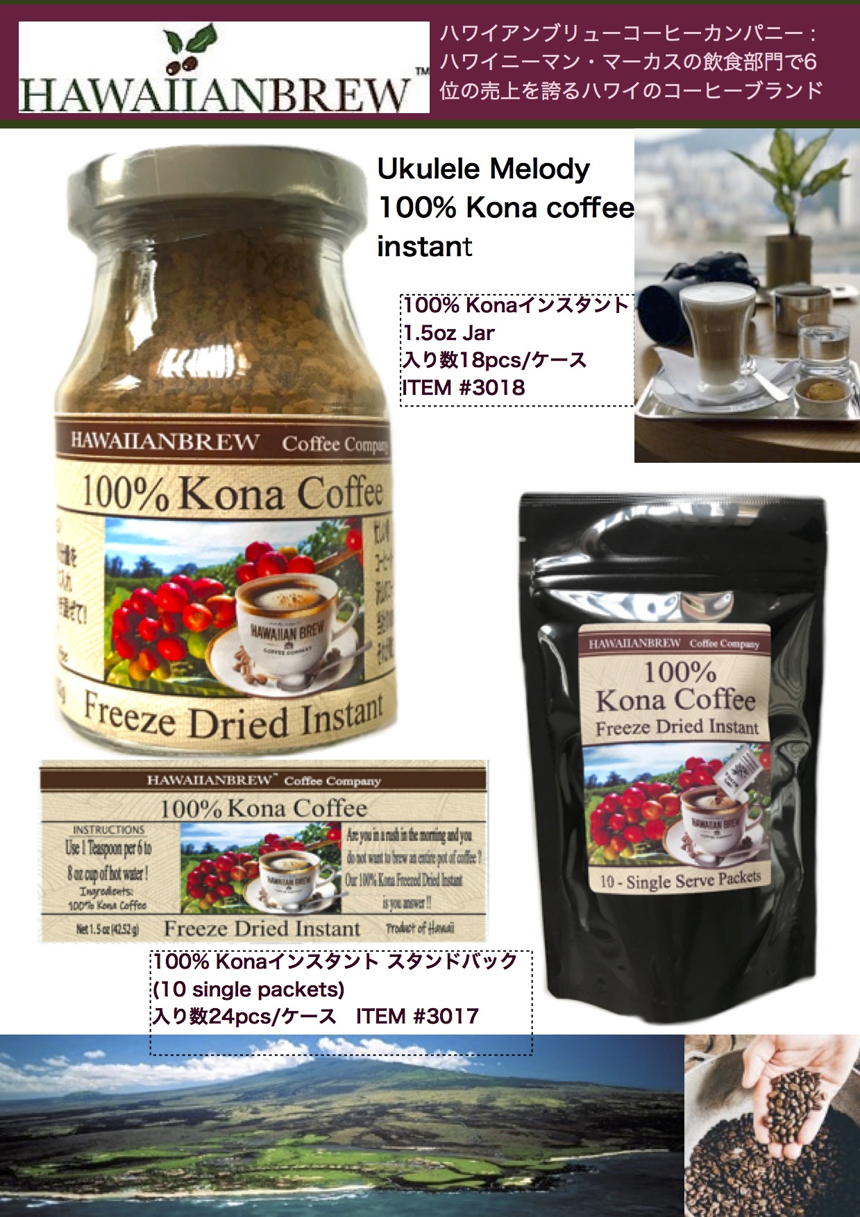 ハワイアンブリュー社から待望の100%コナインスタントが出ました。100%コナインスタントは歴代で一番売れた商品でした。